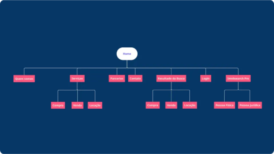 No processo de UX do projeto da plataforma Imobsearch, definimos a jornada do usuário com fluxos de navegação detalhados e estruturamos a interface de busca e visualização de imóveis por meio de wireframes.