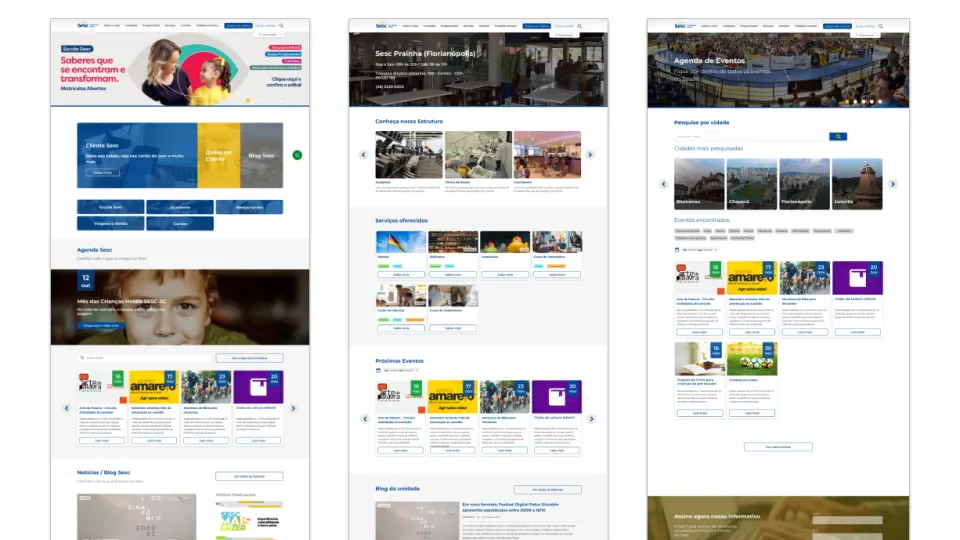 Para solucionar esses problemas, o novo portal foi desenvolvido priorizando a organização e hierarquização do conteúdo, além da padronização de componentes, cores e tipografias, seguindo o manual da nova marca Sesc. Essas melhorias garantiram um layout mais consistente, uma navegação mais fluida e, consequentemente, uma experiência aprimorada para os usuários.